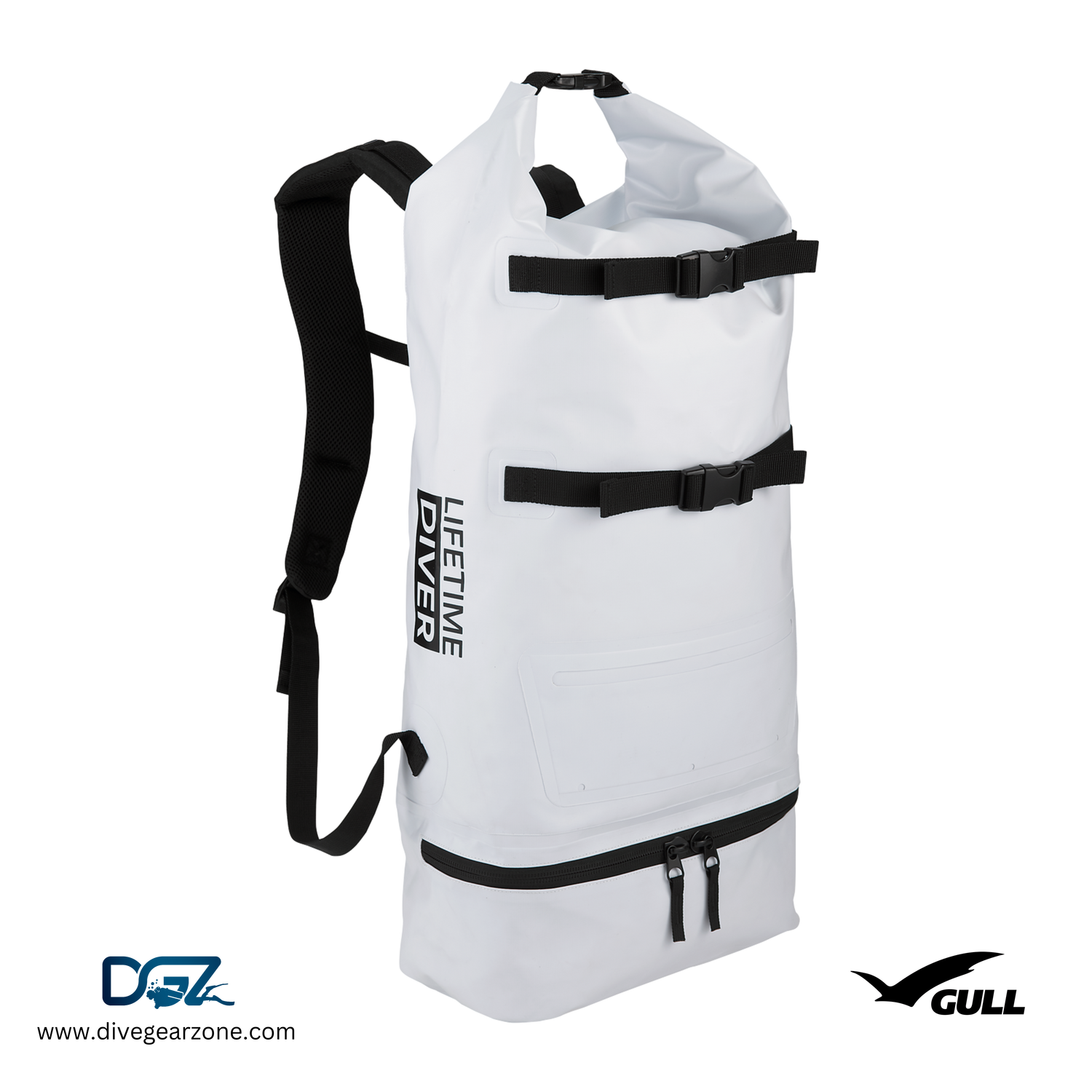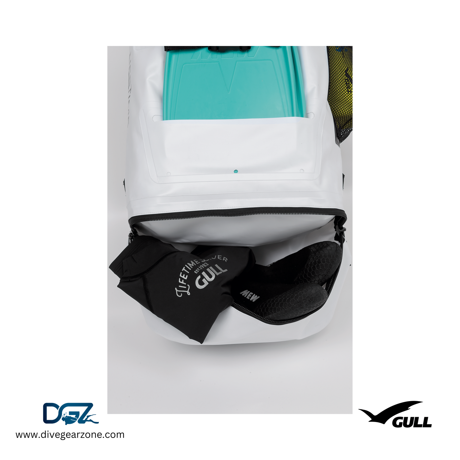 An enhanced snorkeling backpack with two compartments, perfect for storing fins and other items.