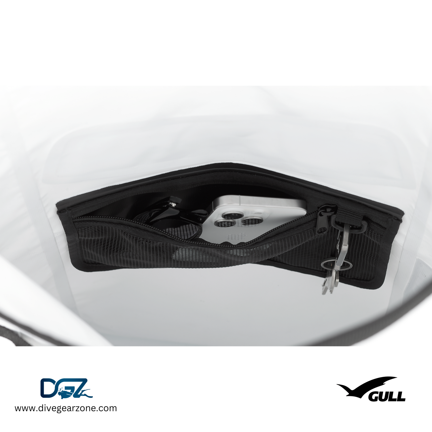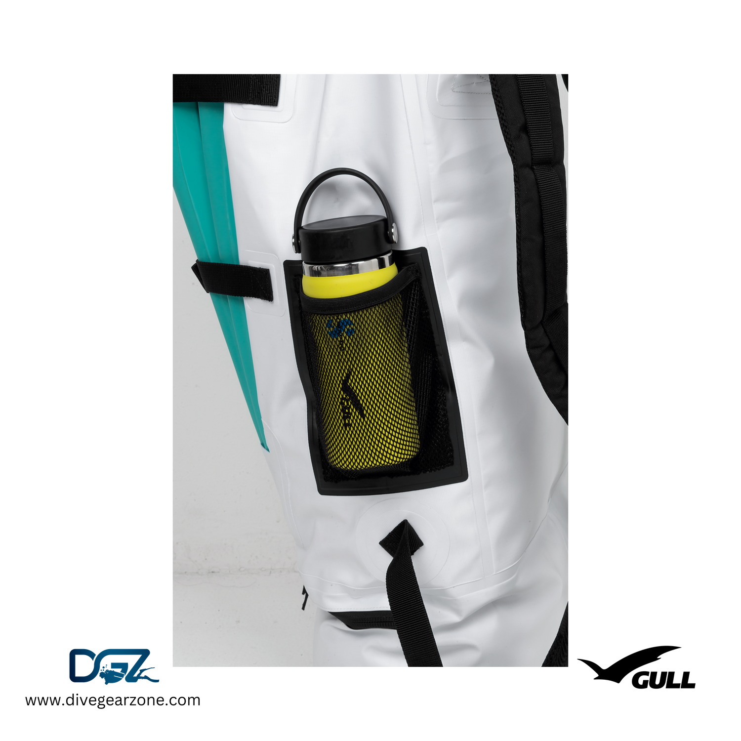 This waterproof rucksack has a front pocket & strap used to securely stow a pair of fins