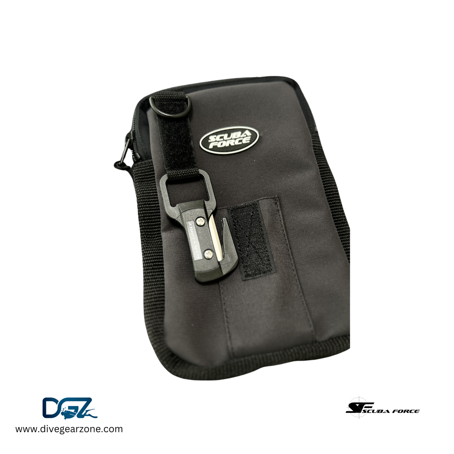 This front pocket is sufficient for storing accessories (22x14x4 cm), with an equipment bungee for additional security of your accessory equipment. The front pocket includes a Scuba Force Line Cutter for added value.