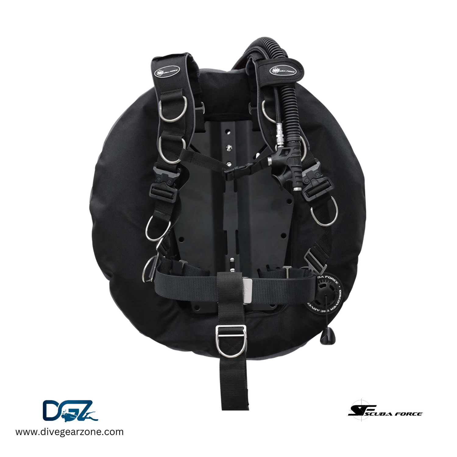 The Scuba Force CTX 45lbs BCD is perfect for divers looking for a BCD with twin-cylinder mounting capabilities. This model includes the Scuba Force 45 lbs wing, made from durable 1000 Denier ballistic Cordura, featuring a dual-layer design that allows for easy internal bladder replacement or servicing. Like all Scuba Force BCDs, the inflators are made in Europe and come with metal fill buttons. The harness in this model is the CTX version, featuring ergonomically shaped shoulder pads with D-rings, providing extra comfort and practicality for technical divers. Additionally, it includes a black powder-coated steel backplate, known for its strength and durability. Customize your set with a choice of five wing colors—black, grey, blue, red, or pink.