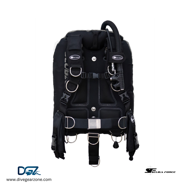 The Scuba Force FZ24 Full Set BCD is built for durability, comfort, and functionality, making it an ideal choice for all levels of divers. It features a padded back pack for extra comfort during extended dives, along with original YKK fastex buckles that ensure a secure and reliable fit. The integrated cylinder fixation system, along with two cambands, provides a perfect hold, keeping the tank stable and secure. The 50mm super soft crotch strap adds to the comfort, while 10 robust metal attachment points offer versatility for accessories.