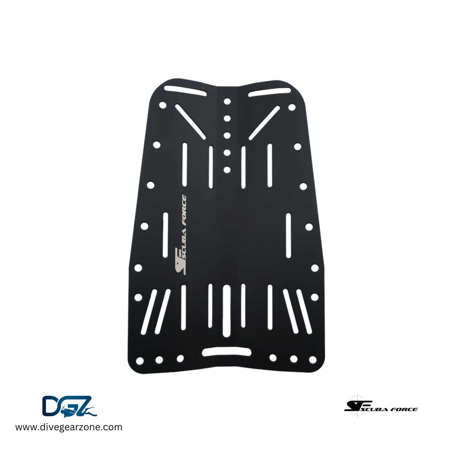 The SCUBA FORCE aluminum backplate has a material thickness of 3 mm and a total weight of 0.7 kg and is a true all-rounder talent. Due to its minimal weight, it is the ideal companion for air travel. Features holes and slots are identical with those of the standard steal plate.