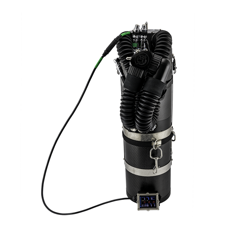 The basic components are taken from the SF2 Backmount version. The SF2 Sidemount has the same compact electronics chamber and inner bellows counterlung. The upper and lower tube are constructed of a very light, yet durable carbon fiber.