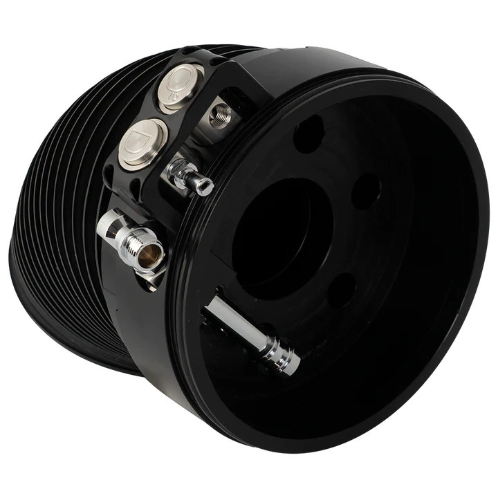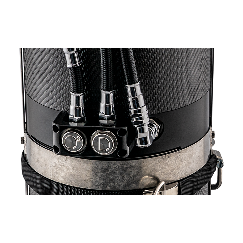 We’ve designed a stainless steel rail at the top of the head and included two large Boltsnaps in the central region held via a hose clamp to allow for a streamlined attachment to your existing harness. The Boltsnaps can be varied in position, so that the rebreather can be positioned individually.