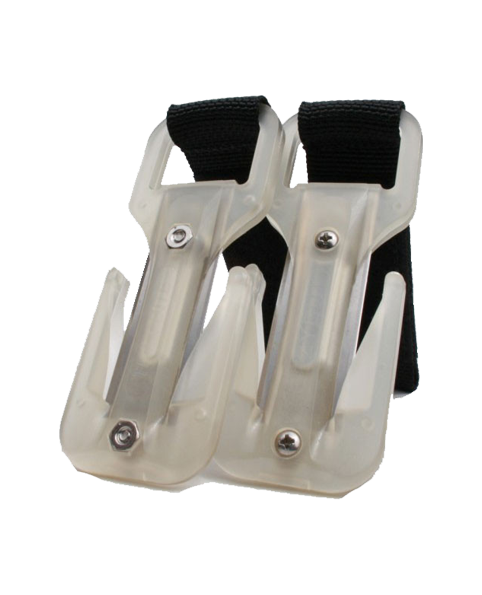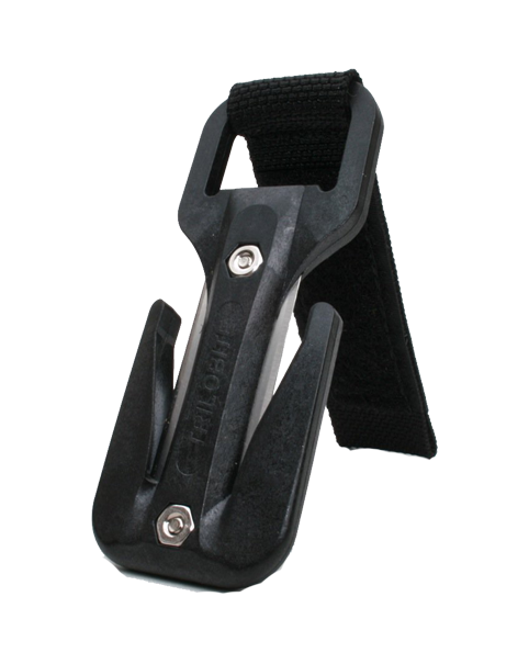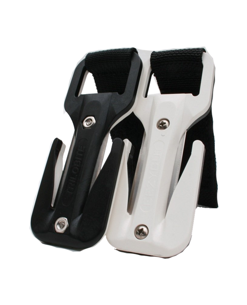 The tool is mounted in a polypropylene handle with a velcro strap for attaching to the pouch, and comes in a choice of pouches. The most popular harness mount pouch fits any { 2 in | 5.1 cm } harness webbing and the small size of the Trilobite means it can be located on any area of a diver's configuration. The wrist mount pouch fits straps up to { 1.125 in | 2.86 cm } wide found on most dive computers, and ensures a snug, movement-free fit. Also offered is a Flexi/Shoulder mount version which is made of neoprene with Velcro closure and is designed for flexibility and accessibility, wrapping easily around webbing, backpack straps etc. This is ideal for mounting on your shoulder portion of your harness.. The Trilobite is available in a variety of two sided color combinations as well as all black and the recently introduced glow-in-the-dark version (appears colorless translucent in daylight).