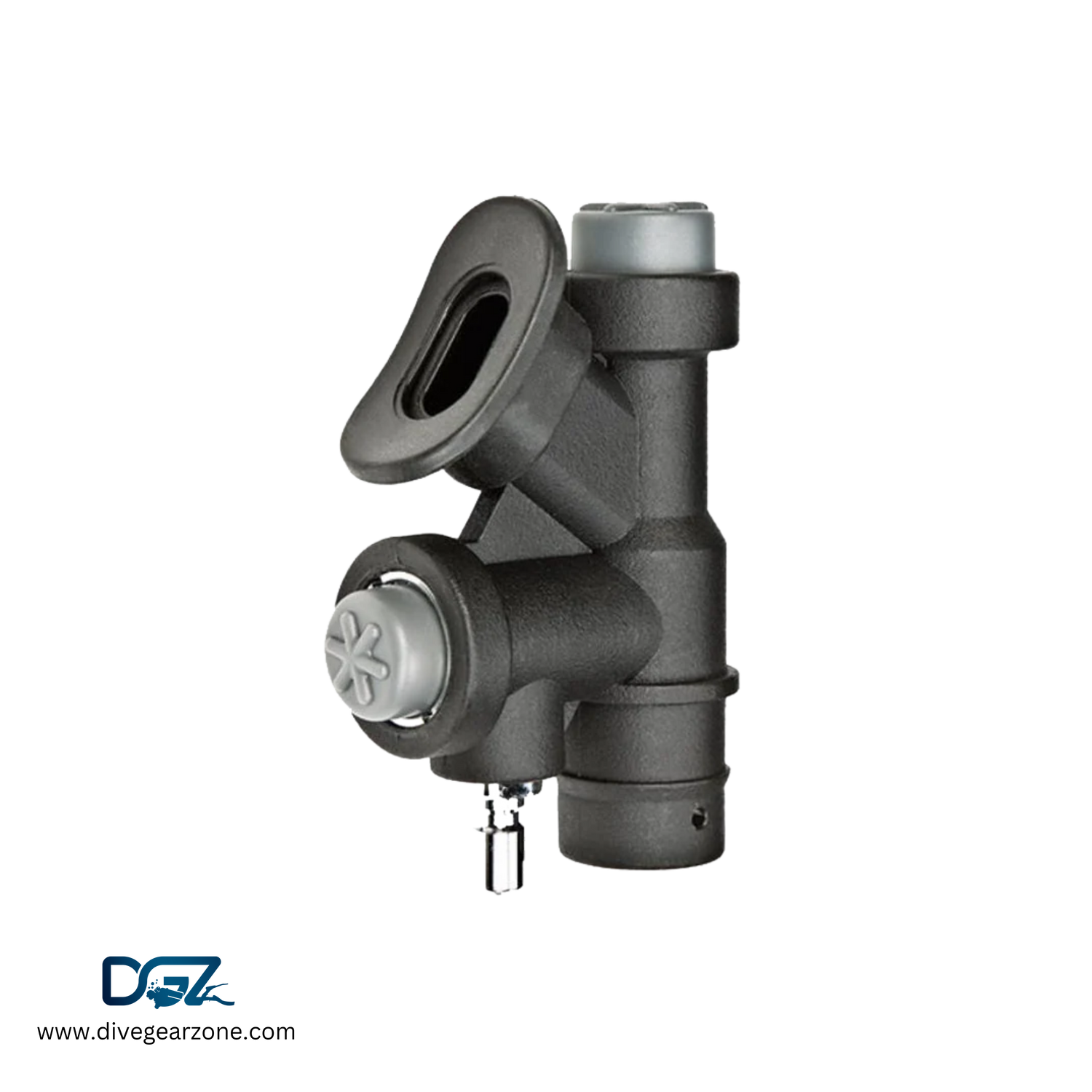 The inflator allows power inflation by pressing the grey side button for quick and effortless buoyancy control. For added safety and precision, a manual oral inflation mouthpiece is positioned alongside the button, enabling controlled inflation when required. The deflate button, located on the top of the unit, allows easy air release from the BCD with a single press.