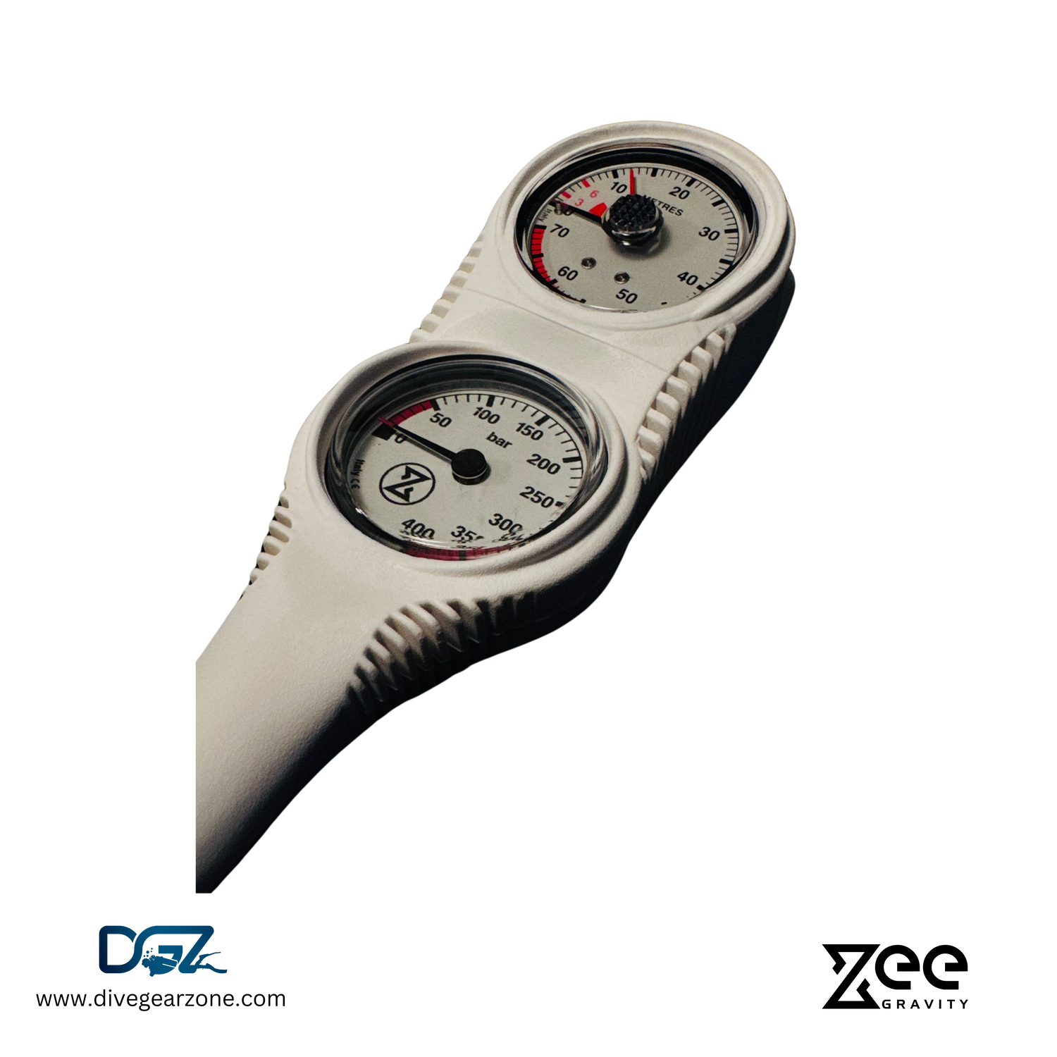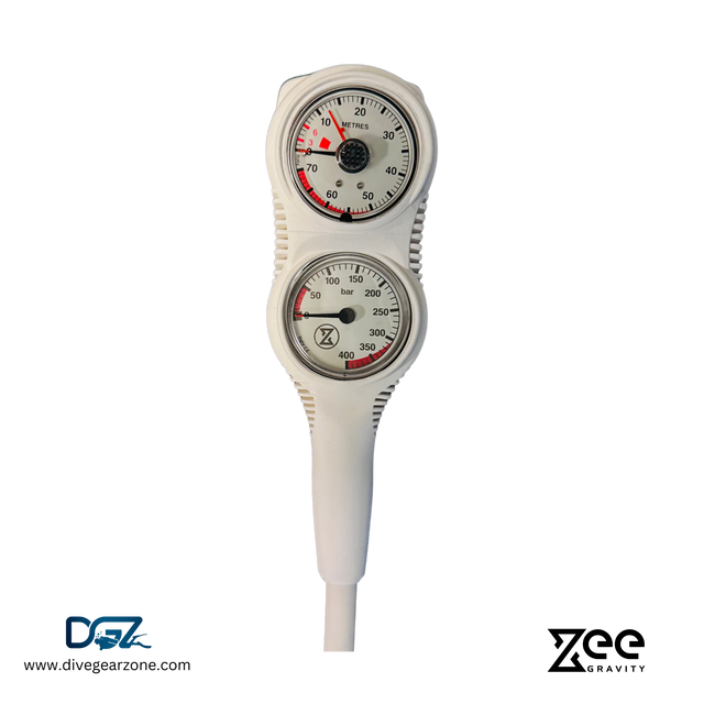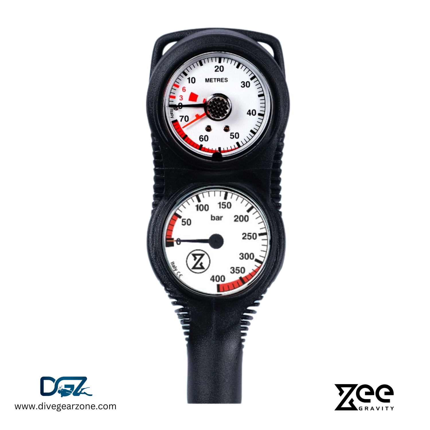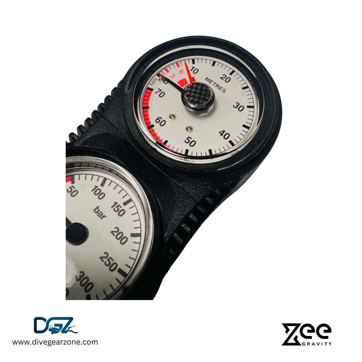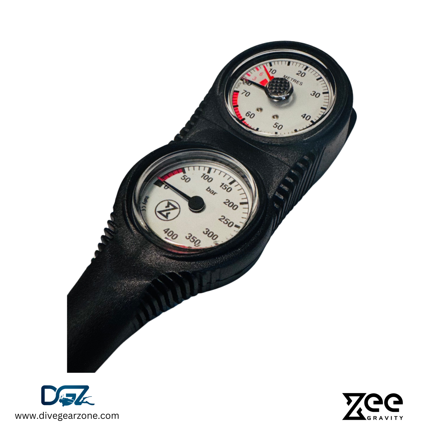 This Zee Gravity 2 console 5omm compact submersible pressure gauge (SPG) and Phosphor Bronze C Bourdon tube depth gauge with hose offers an ergonomic sleek style with a low and compact profile and compact profile and an extremely comfortable grip features a copper beryllium spiral wound mechanism for enhanced durability and performance.