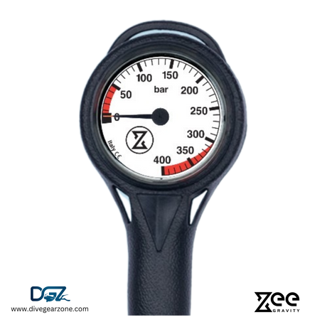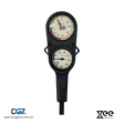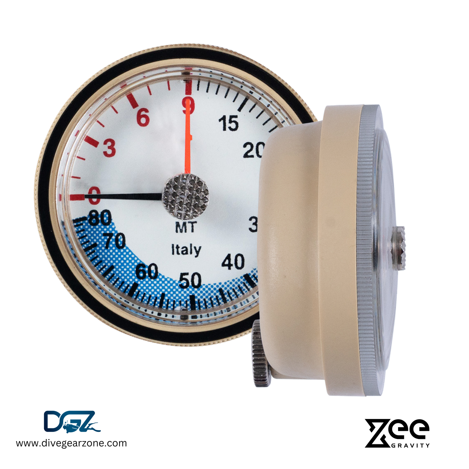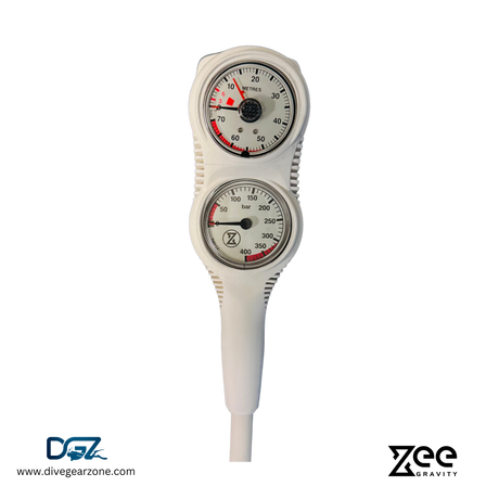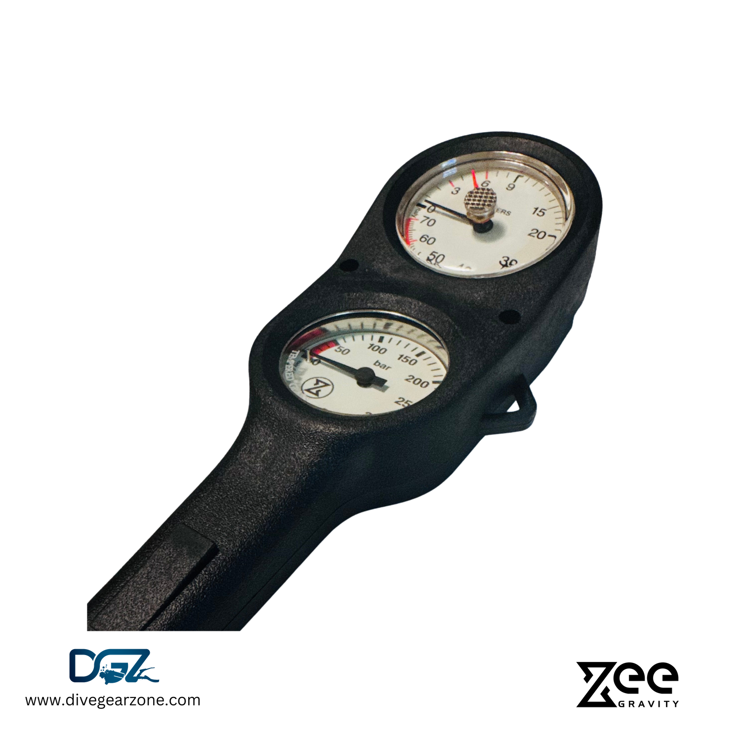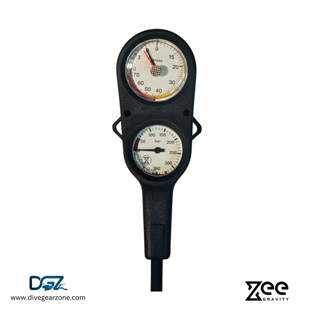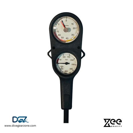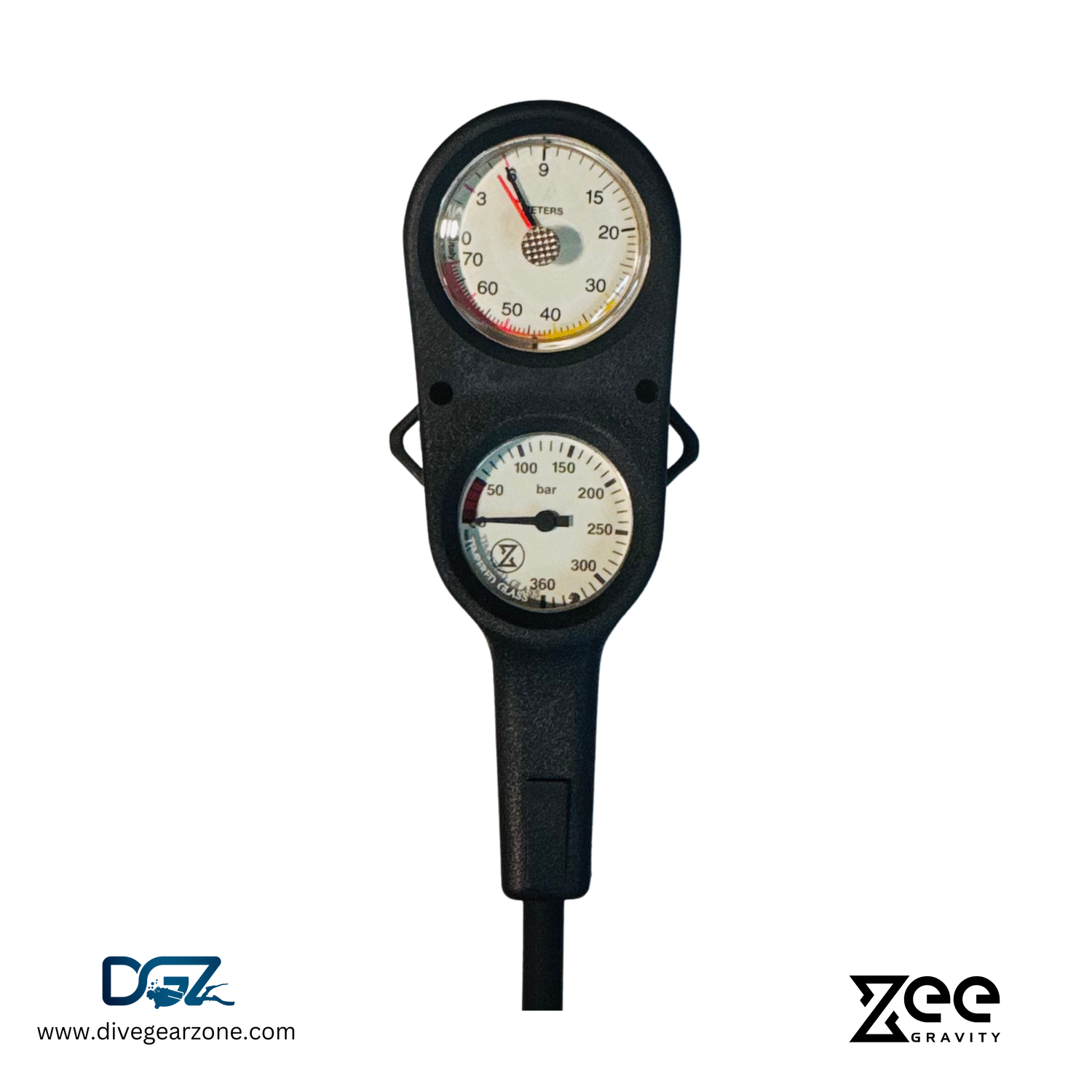 This 2-gauge console by Zee Gravity includes a 52mm submersible pressure gauge (SPG) and a 63mm depth gauge, both featuring a copper beryllium Bourdon tube mechanism with silver welding for superior durability and performance.