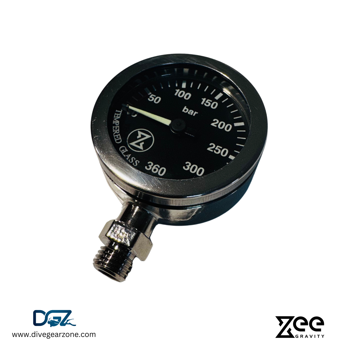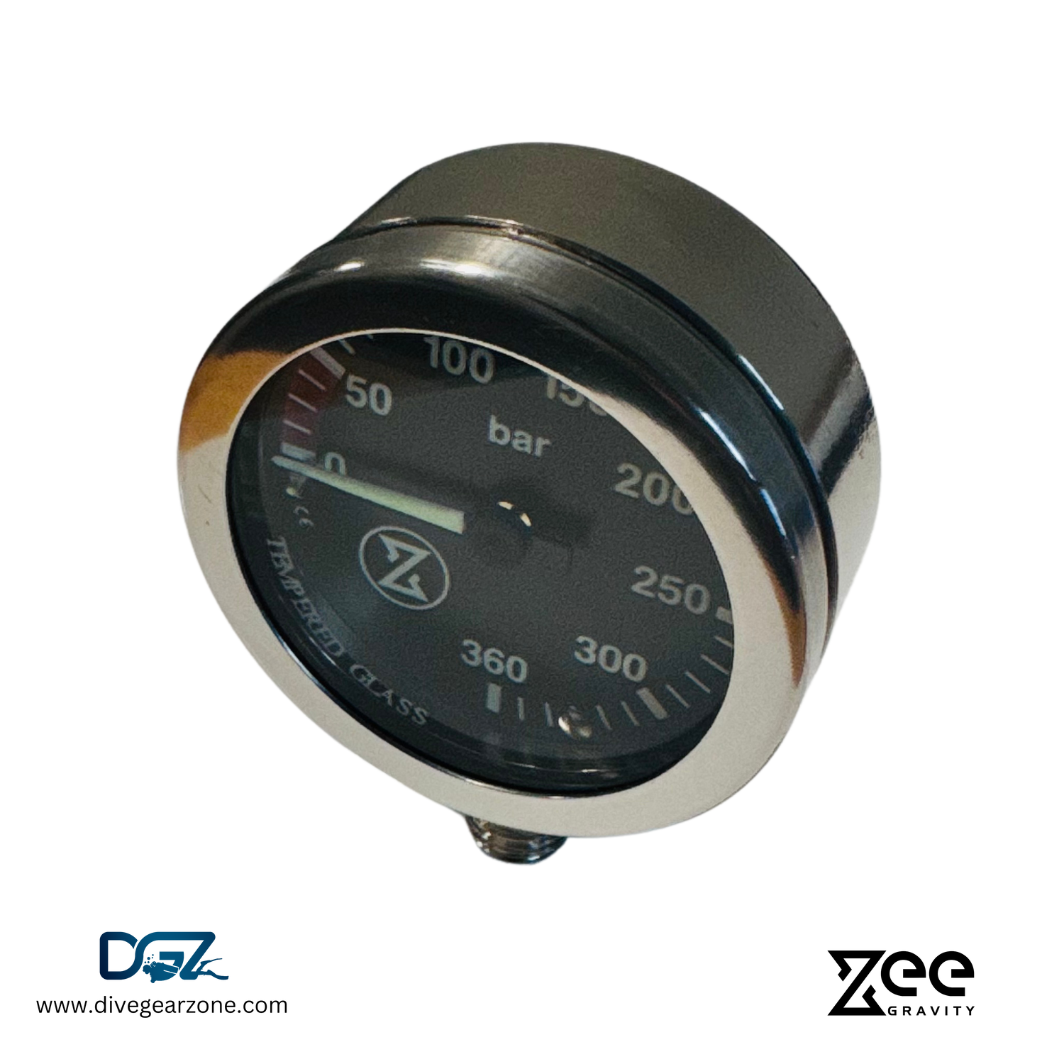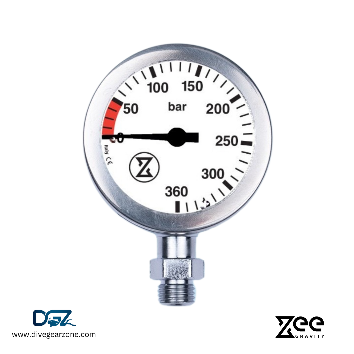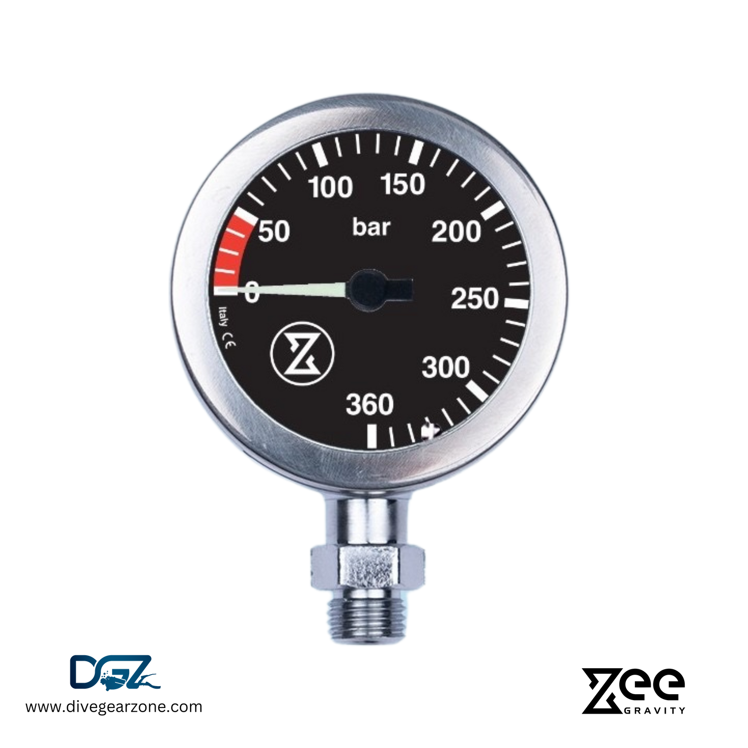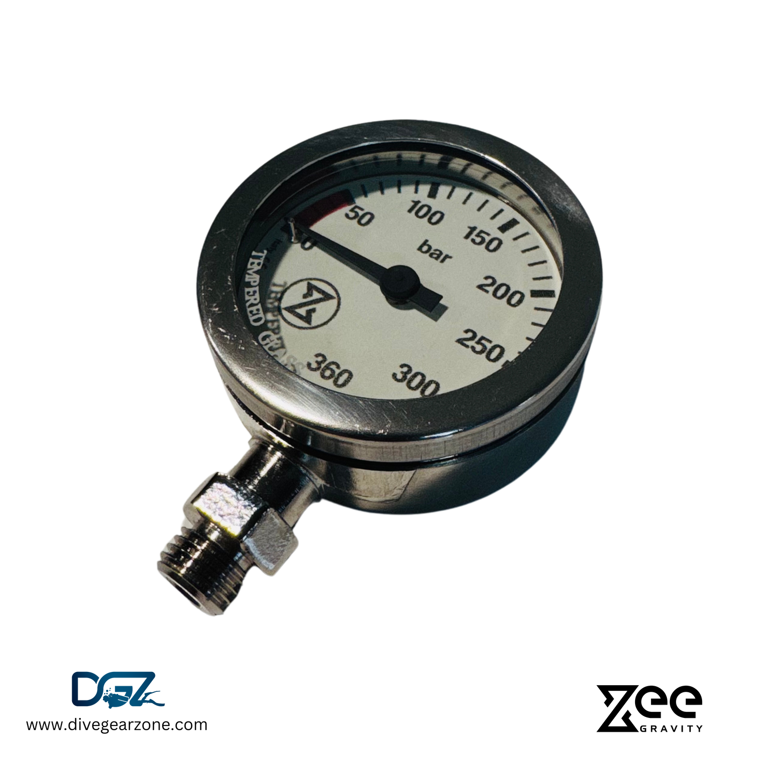 This Zee Gravity 52mm submersible pressure gauge (SPG) features a copper beryllium Bourdon tube mechanism with silver welding for enhanced durability and performance.