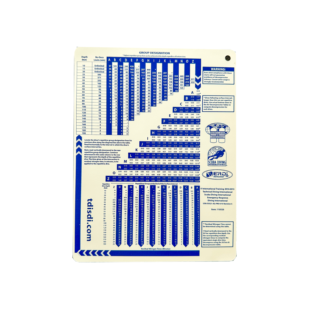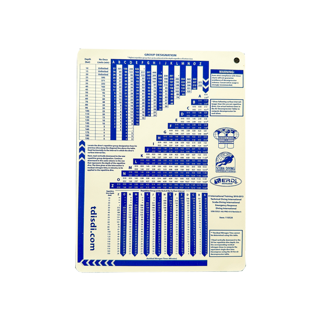 This chart allows the user to plan dive depth and duration as well as show required decompression stop depths. This item is made from a flexible, water-proof, plastic.
