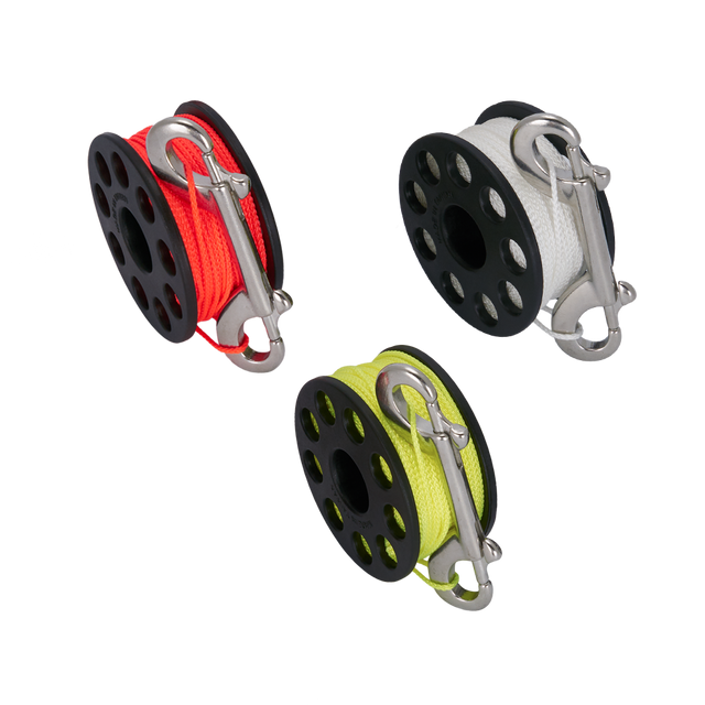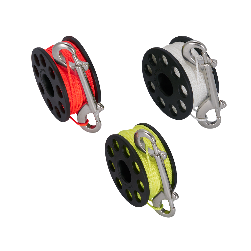 The SCUBA FORCE spools come with a 100 mm Stainless Steel Double Ender and a 30 meters or 45 meters tear-resistant cave line. The spool is made from one piece of very durable Delrin.